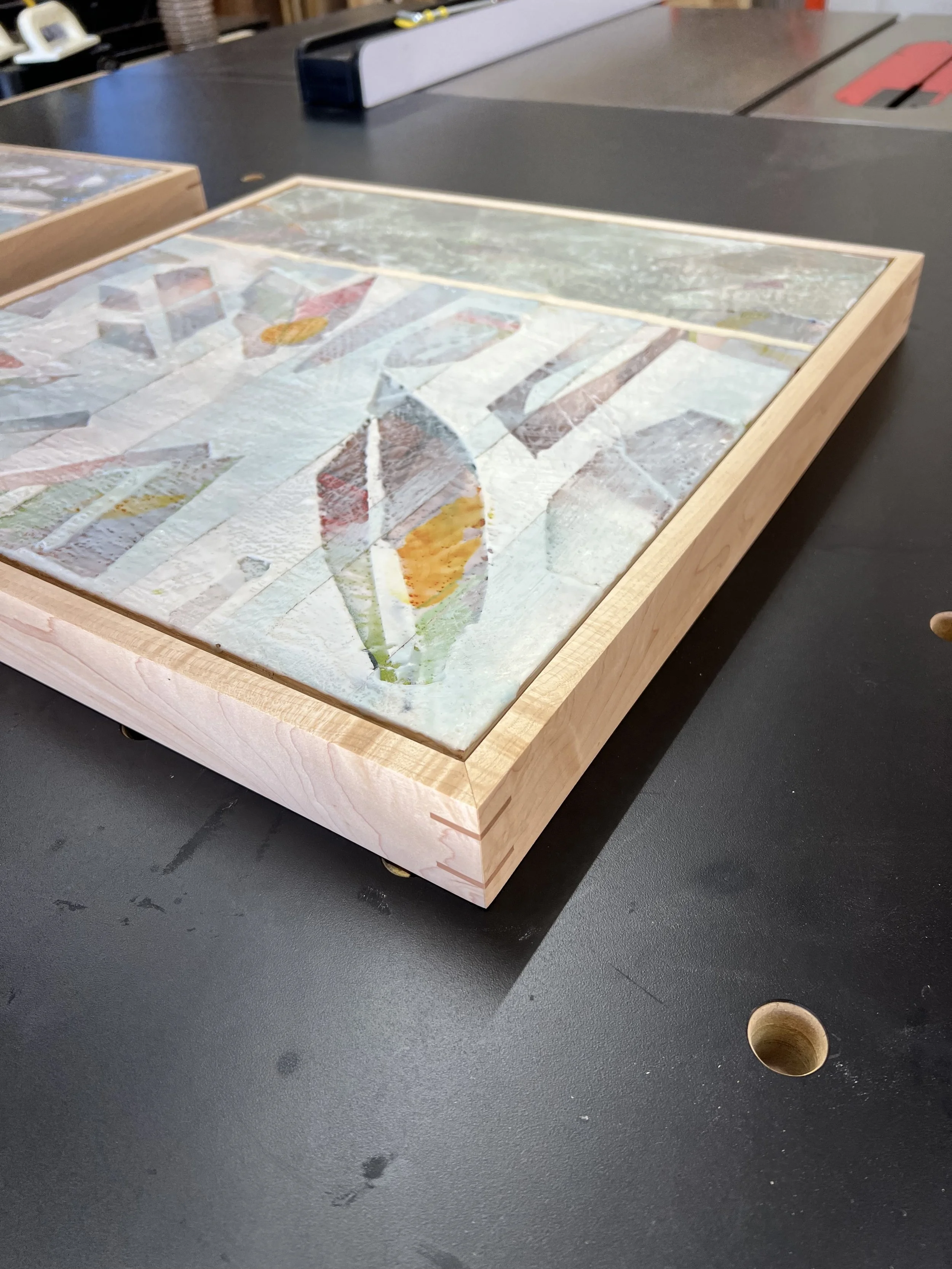 Float mounting your canvas pieces in custom created solid wood frames. A variety of hardwoods available for custom fitting each piece to the right frame.